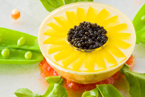 前菜は、お祝いの席に華やかな彩りを沿える、パリ市長賞金賞受賞したスペシャリテ〝海の幸のジュレ – ひまわり – 〟。コンソメベースのゼリーの中に帆立・サーモン・蟹など海の幸が詰まっており、ひまわりの花びらには薄くスライスしたパプリカを1枚1枚丁寧に載せています。