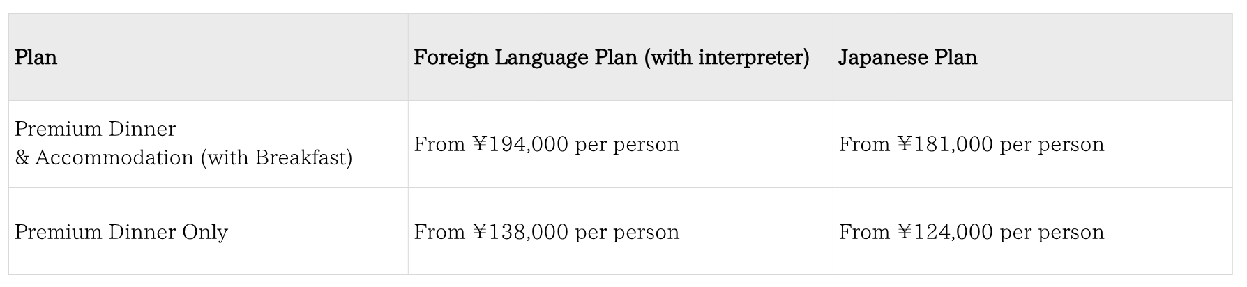 【Price Guideline (per person, based on double occupancy)】