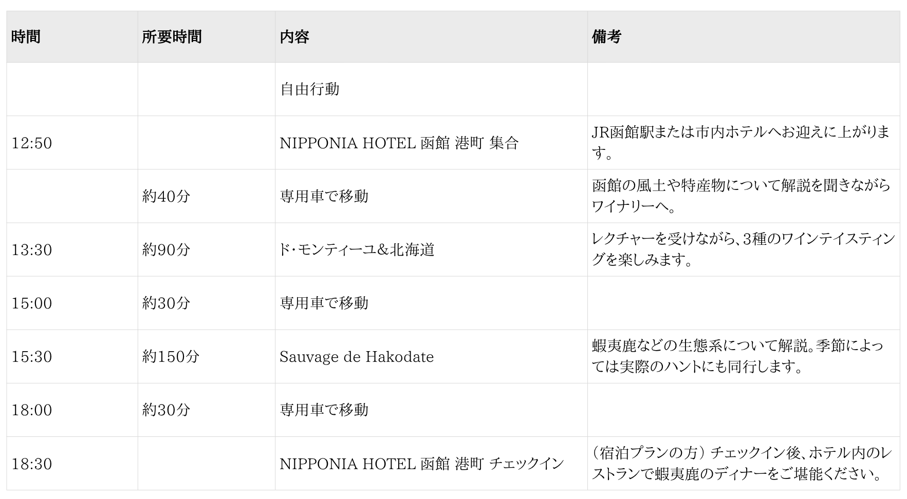 函館近郊で未来の食文化を創造する生産者を訪ねるツアー。ブルゴーニュの名門「ド・モンティーユ」が手がけるワイナリーでは、風土を活かした自然派ワイン造りの哲学に触れます。また、自然、命と向き合う鹿肉の生産者を訪問し、季節限定で実際のハントに同行。ご希望者は解体の様子も見学可能です。