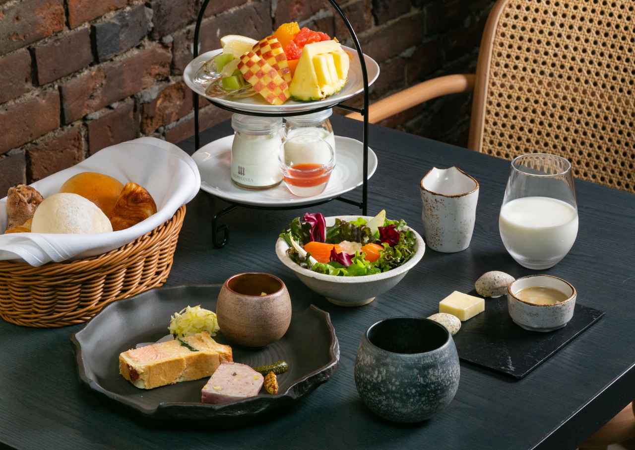 地元野菜のサラダやサーモンのパイ包み、自家製パテや卵のムースなど、和と洋が調和したメインプレート。季節のフルーツタワーや「キングベーク」のパン4種、自家製バター3種を添えた、彩り豊かな朝食をお楽しみください。