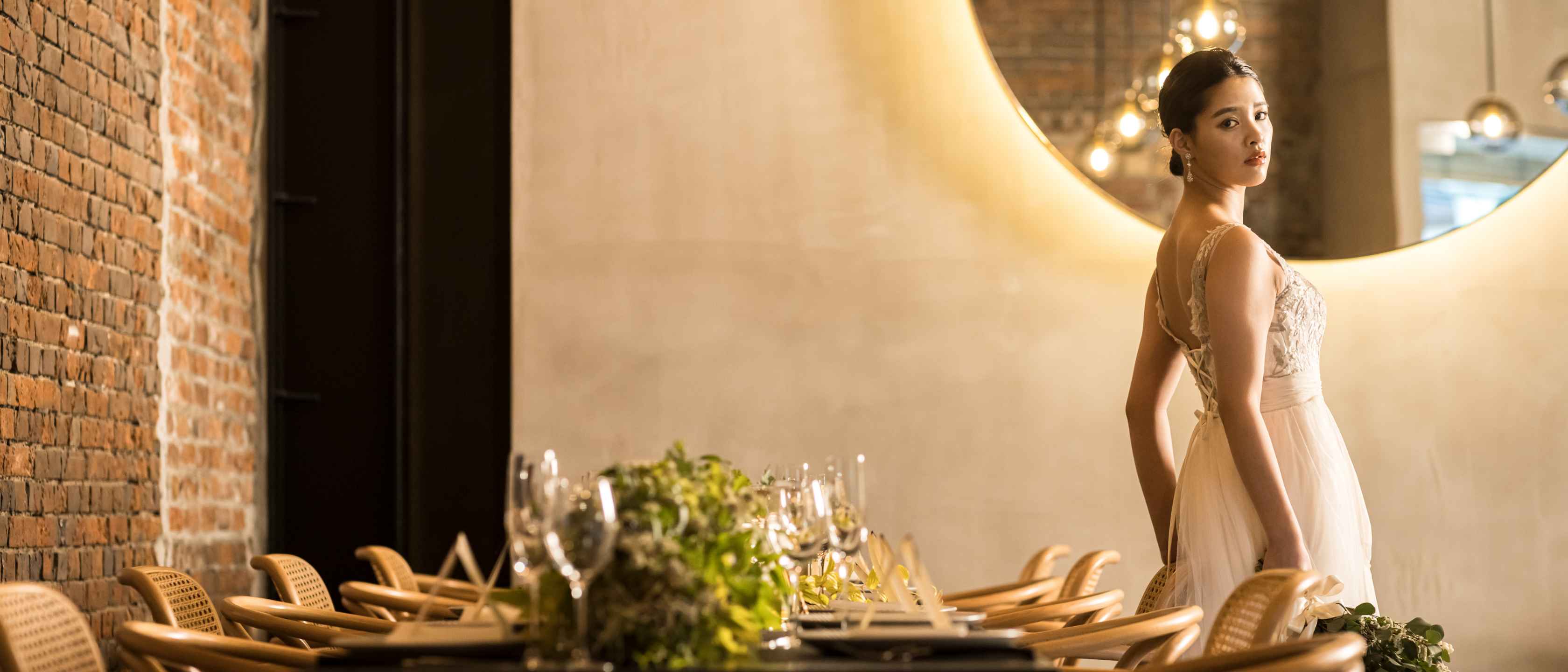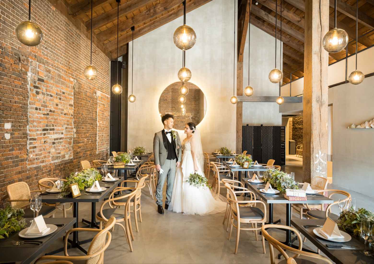 世界三大デザイン賞の一つである「iFデザイン賞」を受賞しており、内装は独特の曲線美を持つ北欧デザインの家具でコーディネート。レンガと木目調が美しく調和した空間はドレスも着物も引き立ててくれる。時代を超えて輝き続ける建物だからこそ、結婚式後もふたりの思い出の場所に。