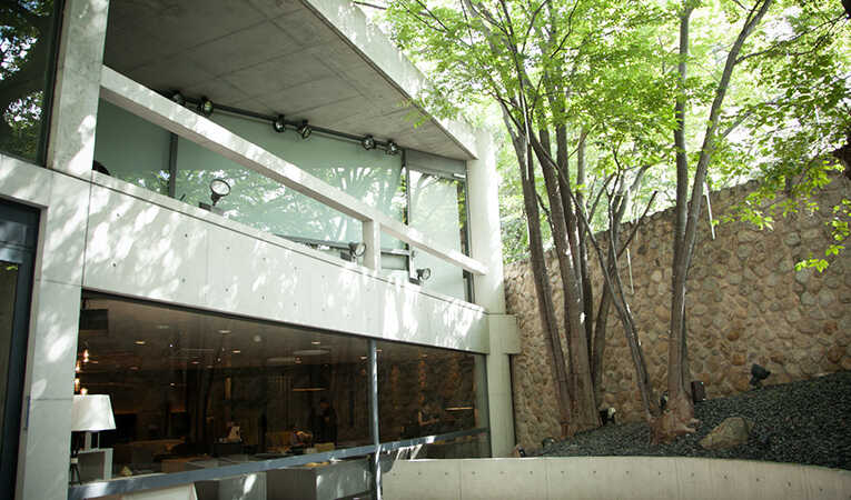 緑の森に包まれた東山の隠れ家。元は銅加工会社オーナーの邸宅で、随所に銅があしらわれた建物に、レストラン、シェフズカウンター、日本茶カフェなど多目的に利用できる。